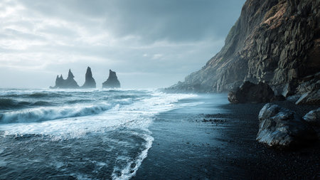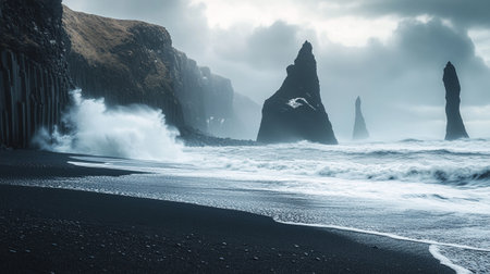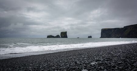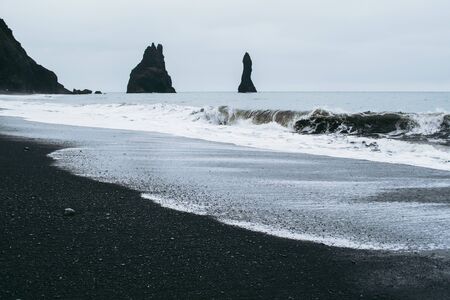 Famous panorama of the black sand beach in Iceland. Dark waves of Atlantic ocean waves covering the sand