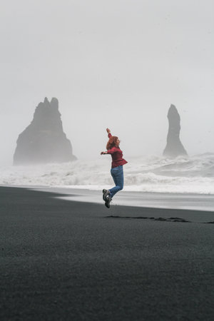 Jumping woman on Reynisfjara black beach scenic photography. Picture of person with column cliffs on background. High quality wallpaper. Photo concept for ads, travel blog, magazine, article