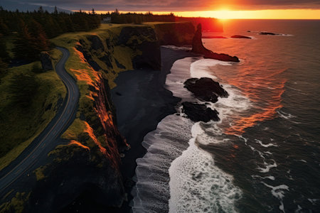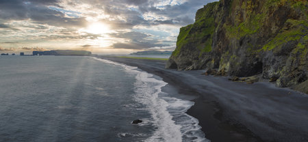 Aerial view of Reynisfjara Beach at sunset, Iceland