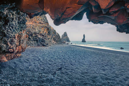 Dramatic summer scenery. Gloomy morning view of Reynisdrangar cliffs in Atlantic ocean. Majestic summer scene of black sand beach in Iceland, Vik location, Europe.