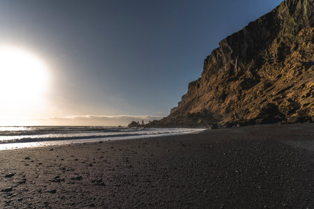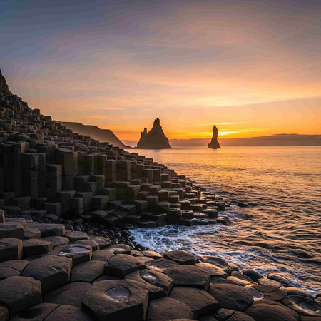 Volcanic formations on the black sand beach of Reynisfjara at sunset in Iceland