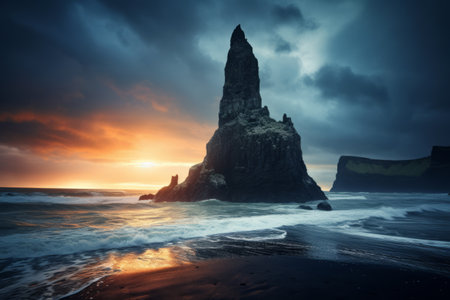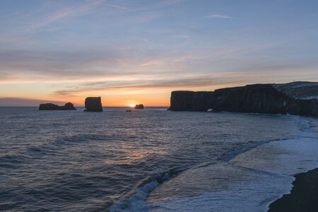 Sunset at Reynisfjara Beach, Iceland. Reynisfjara is a black sand beach on the southern coast of Iceland.