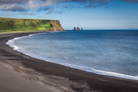 The peaceful seafront of Kirkjufjara beach and Arnardrangur cliff. Location Atlantic ocean near Vik village, Iceland, Europe.