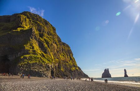 The famous Black Sand ocean Beach, mount Reynisfjall and Picturesque Basalt Columns, Vik, South Iceland. People unrecognizable.