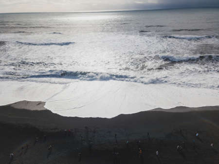 White foam on a black lava beach in southern Iceland. Sea aerial view and top view. Amazing nature, beautiful backgrounds and colors