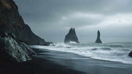 Aerial and moody view of the Reynisfjara Black Beach of Vik, Iceland