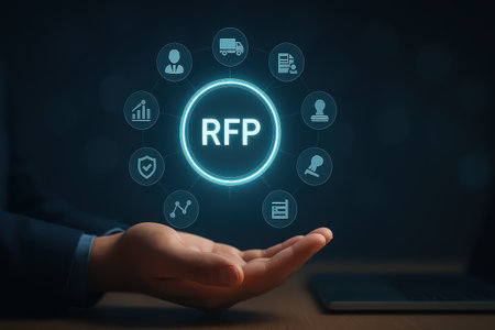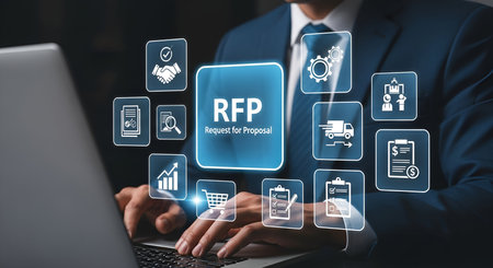 A man in a suit is typing on a laptop with a central glowing blue box displaying RFP Request for Proposal. Surrounding the box are various business icons including a handshake, document, magnifying glass, shopping cart, graph, clipboard, truck, and gears. The image conveys business processes and digital interaction.