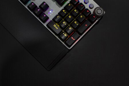 Closeup photo of workplace with led rainbow backlight gaming usb keyboard of computer lying on table in dark room