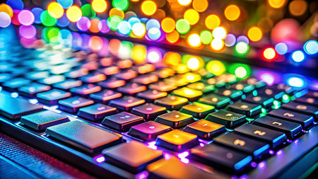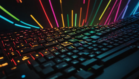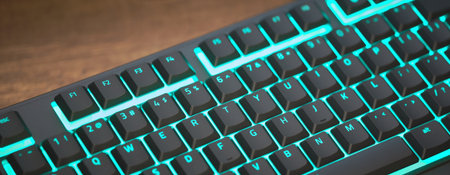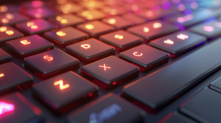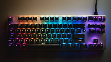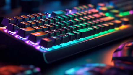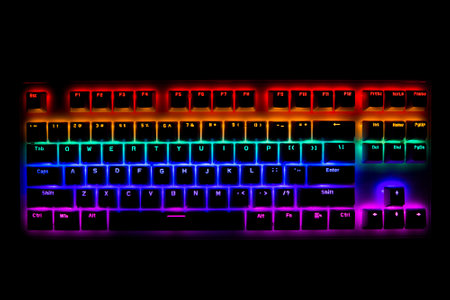 gaming keyboard with colorful RGB LED backlighting across the mechanical switches. High quality photo