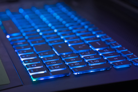 close-up of notebook keyboard with blue light tint, new technology