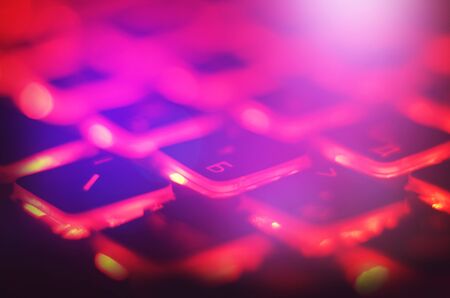 Working on a neon computer keyboard with colored backlighting. Computer video games, hacking, technology, internet concept. Selected focus.