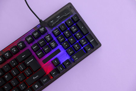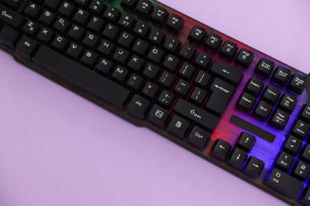 Modern computer keyboard with RGB lighting on violet background, top view