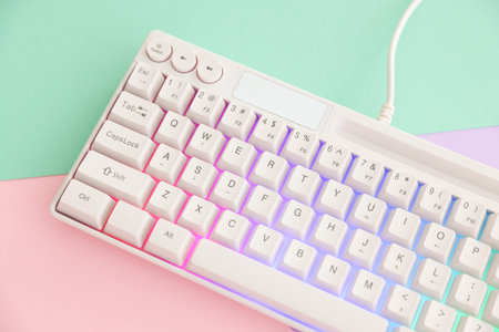 Modern computer keyboard with RGB lighting on color background, above view