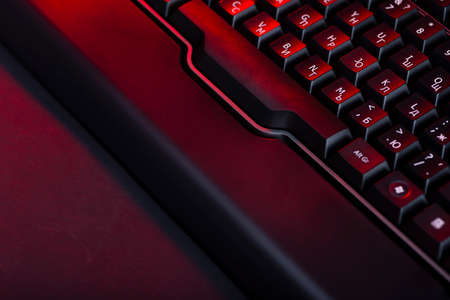 Mechanical gaming keyboard with backlight, close-up. Gaming keyboard with RGB backlight. RGB LED keyboard