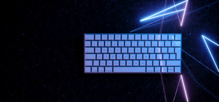 Neon computer keyboard with color backlight. Computer video games, hacking, technology, internet concept. Selected focus.