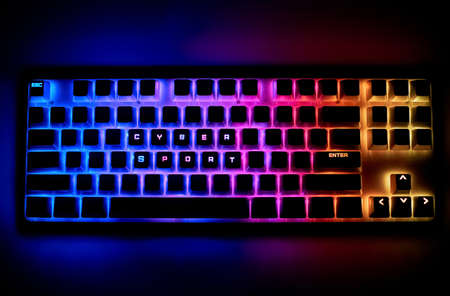 The concept of cyber sports. Keyboard with the word: Cyber Sport. Participation in esports games.