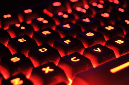 Computer keyboard with red lights, close-up, shallow depth of field