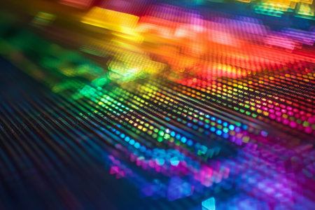 A stunning display of multi-layered, glowing digital waves cascades across a modern screen, blending vivid hues, fine pixel intricacies, and lively illumination in a