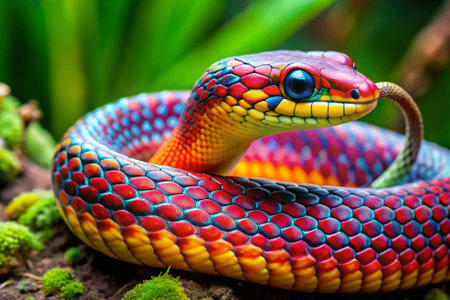 Colorful snake with vibrant scales open mouth resting on a branch in a lush rainforest