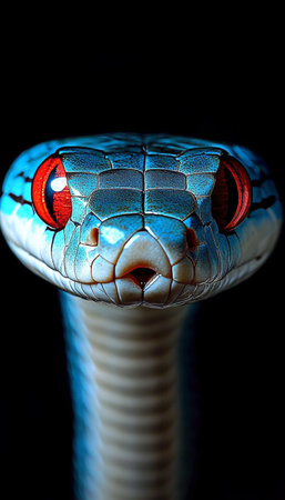 Close-Up Portrait of a Majestic Teal Serpent with Striking Red Eyes on a Mysterious Black Background