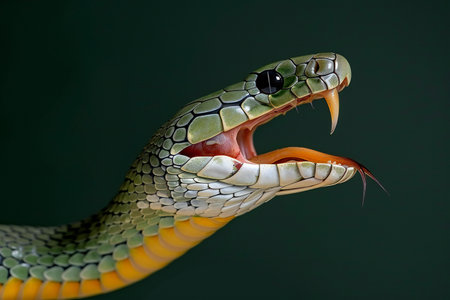 Close up of the head of a green pit viper snake with open mouth