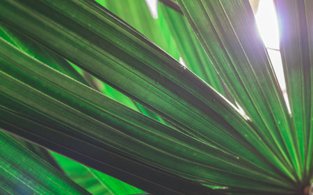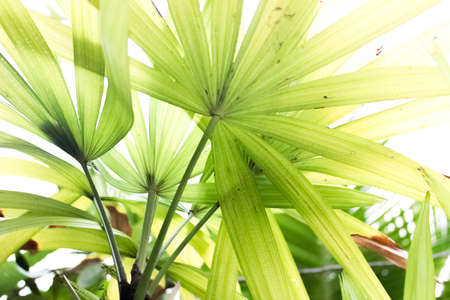 Close up of green leaf bamboo palm or lady palm (Rhapis exclesa, PLAMAE) with sun flare. Green nature leaves textured abstract background.