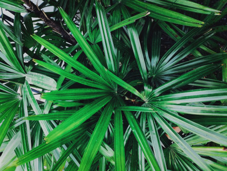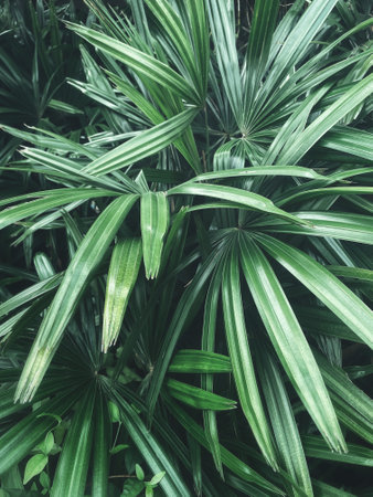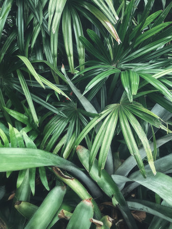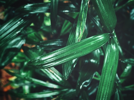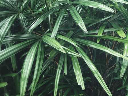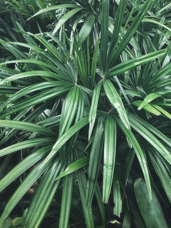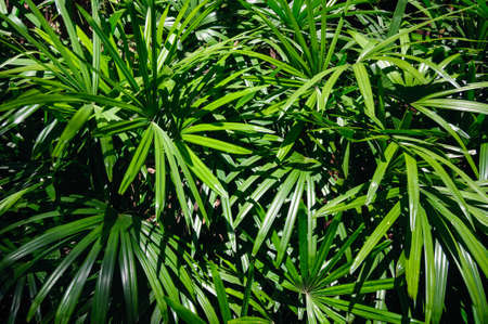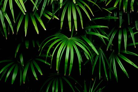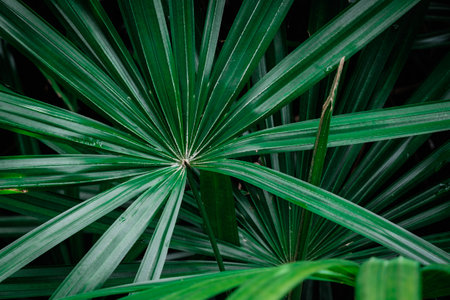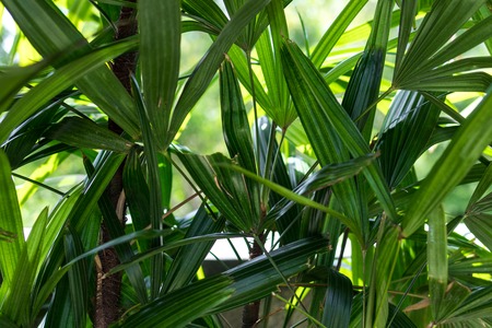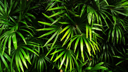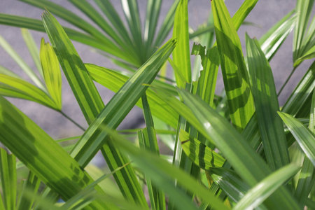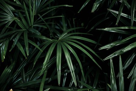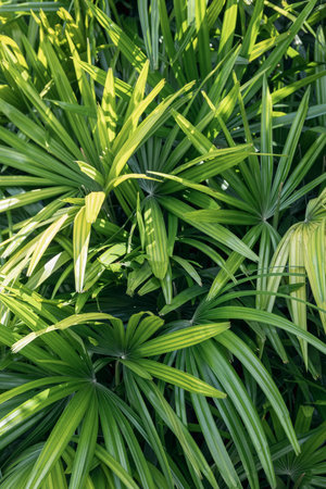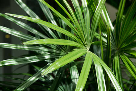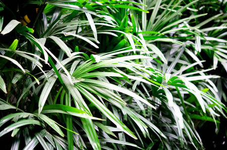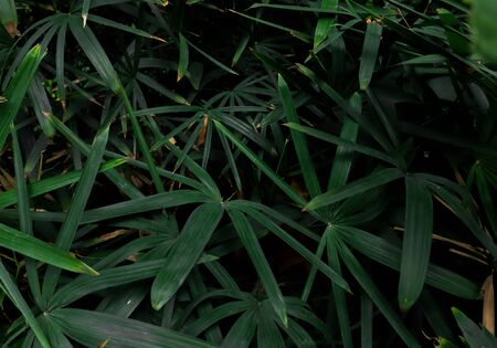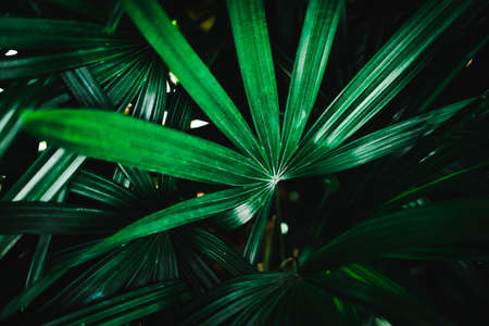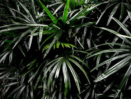 Light and shadow on surface of Green Lady palm leaves in botanical Garden in dark tone style, Beautiful nature background