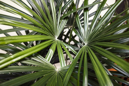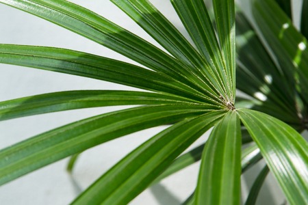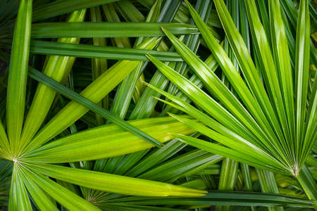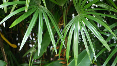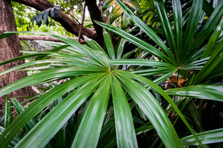 Licuala palm leaves, green fan palm leaves close up
