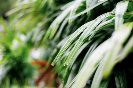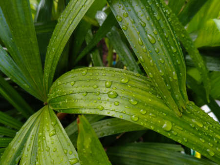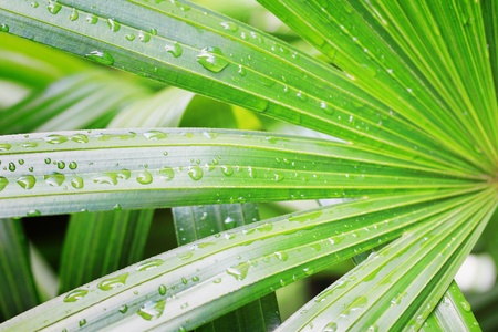Close-up of green palm leaf with raindrops. Nature background