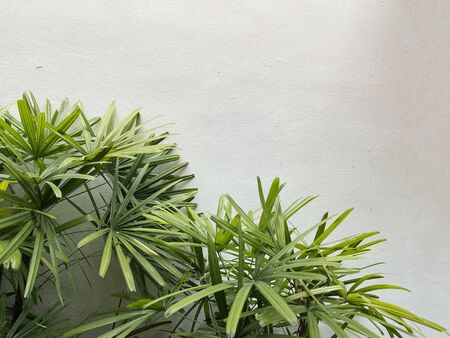 Natural green palm leaves with cement wall background, Livistona Rotundifolia Palm, borassus Flabellifer.