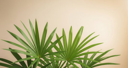 Tropical palm leaves on beige background with copy space.