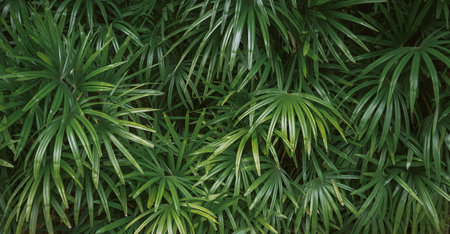 Lush overlapping tropical palm leaves creating a dense green foliage pattern with natural texture and dramatic botanical symmetry.