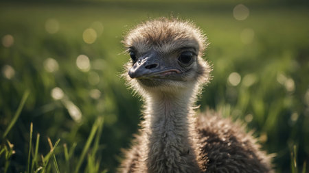 AI Generated. Close-up of a young ostrich chick in a green field