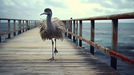 an ostrich stands on a wood platform at the jetty of a beach. the photograph captures the detailed portrait of the ostrich, with a brooding mood and a wandering eye. the dark beige and light aquamarine colors create a gritty texture. the scene is filled with brightly colored birds, creating a wimmelbilder-like atmosphere. ai generated