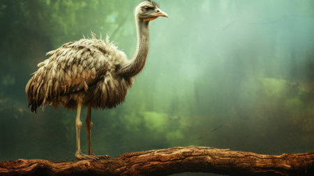an ostrich, rendered in cinema4d by john wilhelm, stands gracefully in front of a tree branch. this high-resolution, uhd image captures the misty atmosphere of a mysterious jungle. the attention to detail in the fur and feathers texture of the ostrich adds to the overall realism of the scene. creative commons attribution. ai generated