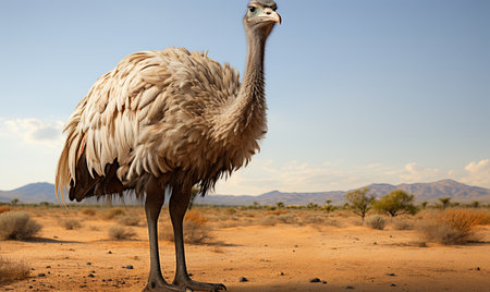 A lone ostrich standing in the middle of a vast desert landscape under the bright sun.