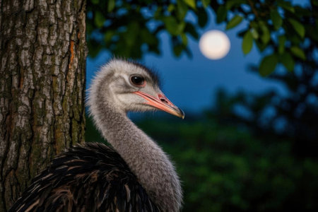 Ostrich in front of a full moon in the night.