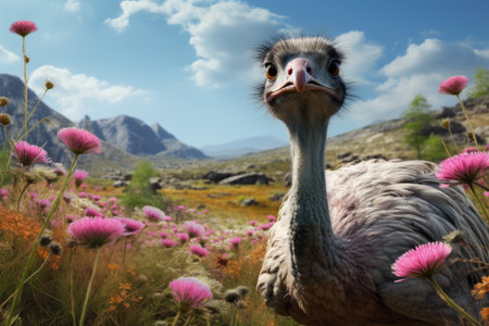 A picture of an ostrich standing in a field of colorful flowers. This image can be used to depict the beauty of nature or to illustrate the concept of unexpected encounters.