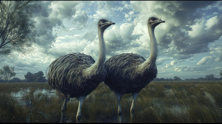 A stunning portrayal of two ostriches in a vibrant green landscape, showcasing their majestic presence against a backdrop of dramatic sky and fluffy clouds.