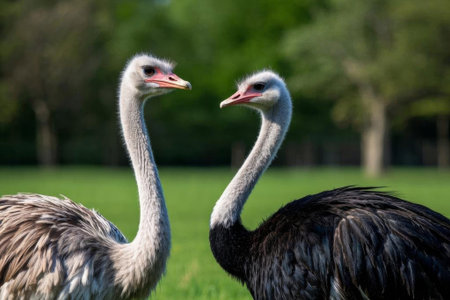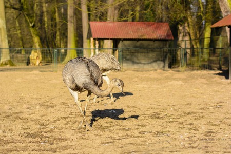 Pair of African ostriches (Struthio camelus) with beautiful feathers walking