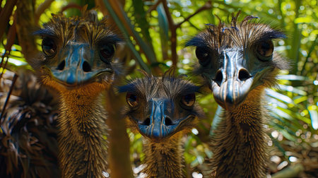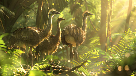 Group of Emu birds in the wild jungle. AI Generated.