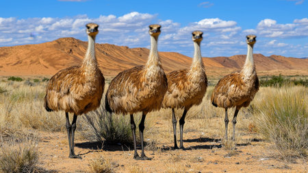 A striking image of four large desert birds standing in a sunny landscape under a vibrant blue sky with white clouds offers a glimpse into wildlife and nature.