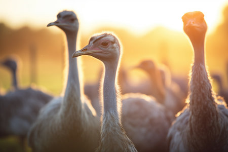 brightly lit ostrich flock at golden hour
