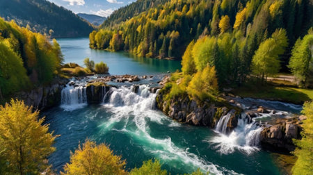 Beautiful autumn landscape with mountain river and waterfall in the forest.