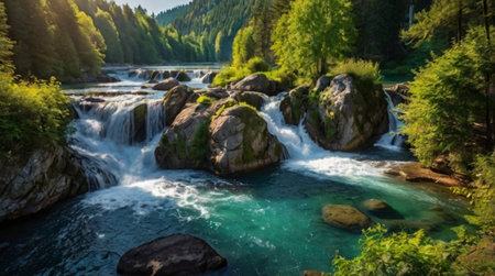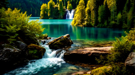 A beautiful waterfall pours into a calm river, surrounded by lush greenery. Sunlight streams through the trees, creating a peaceful atmosphere in nature during the golden hour.