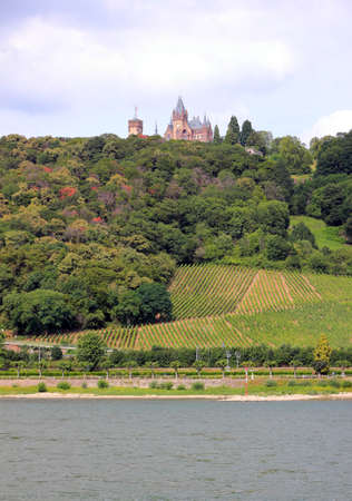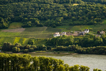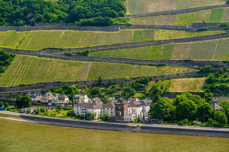 Beautiful German landscape with tiered vineyard and village seen from the middle Rhine River.