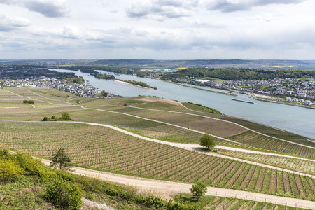 Panorama of the middle Rhine River valley with beautiful vineyards sloping down to a distant medieval village of Rudesheim, Germany.