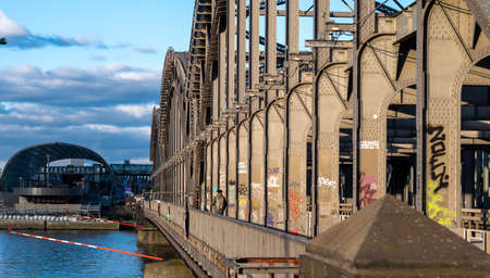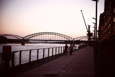 Cologne, Germany - November 24, 2016: Pedestrians walk along the Rhine promenade at the southern bridge during the sunset on November 24, 2016 in Cologne.
