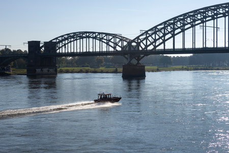 Nijmegen, The Netherlands - September 24, 2023: Cityscape of Nijmegen with scenic view of Pancake restaurant ship passing the bridge in river Waal on a sunny autumn day.