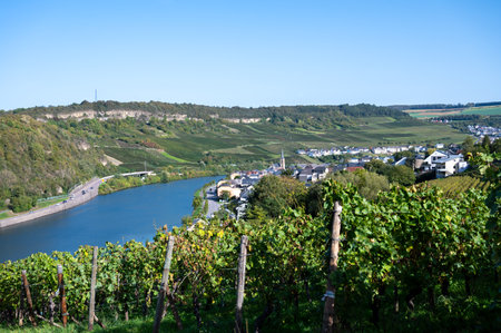 Terraced hilly vineyards in Luxembourg. Traditional method of production of white wine and cremant sparkling wine in Luxembourg country on Mosel, Mosel, Moselle or Musel river.